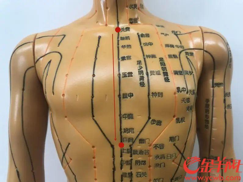 任脉起于胞宫,出于会阴,沿人体腹部正中循行,被称为“阴脉之海”。我们刮痧取天突穴(胸骨上窝正中)穴至巨阙穴(胸剑联合中点下2寸)一段。从天突穴刮至巨阙穴,操作方法同前。