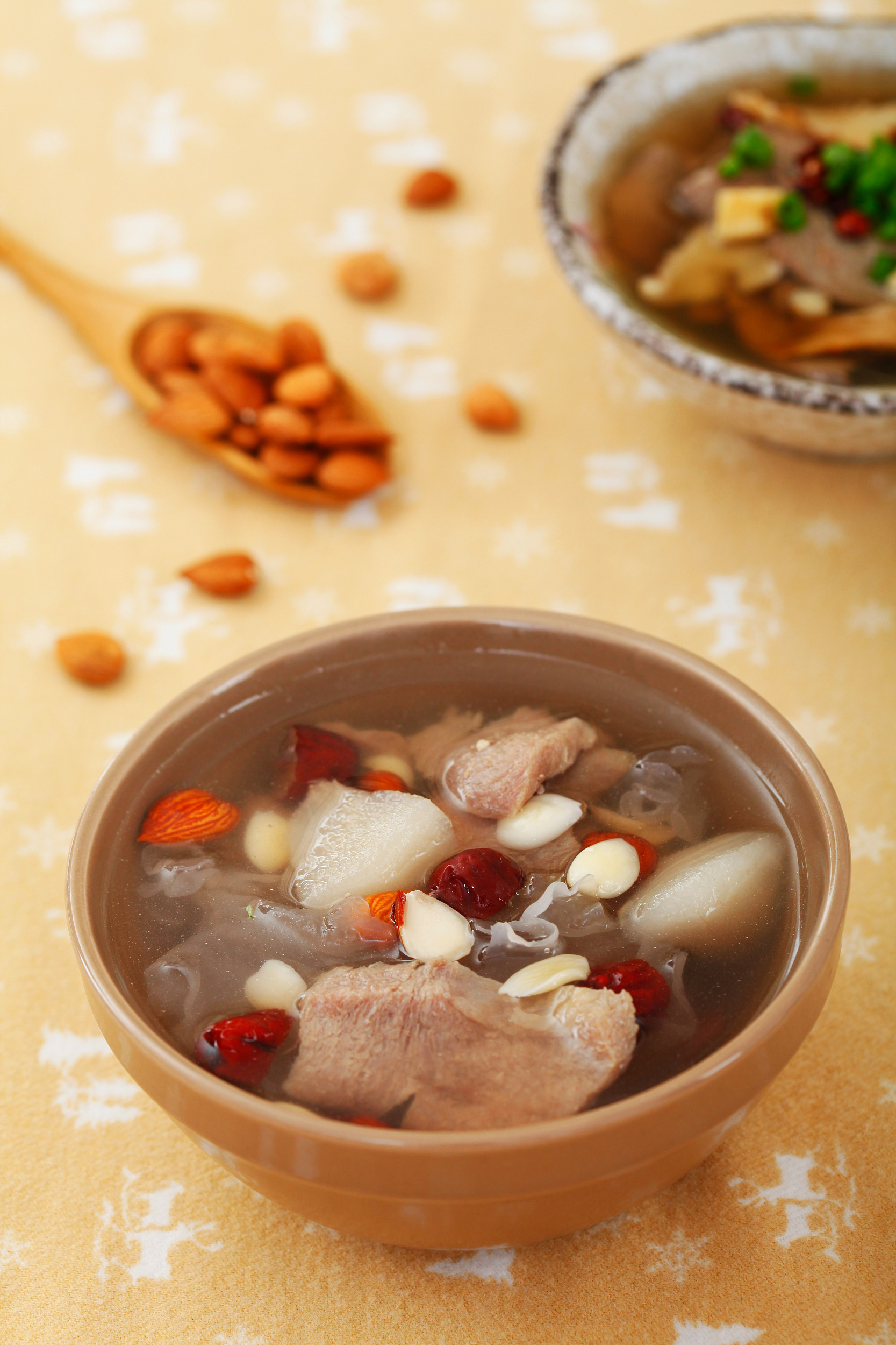南杏仁也叫甜杏仁,味道较甜,而北杏的味道较苦,两者功效略有区别。南杏具有润肺、止咳的功效;而北杏中含有氢氰酸,多用于药,具有润肺、平喘的作用。在补肺益肺时选用南北杏,而这款汤里用南杏仁量多,因为功效偏于宣肺润燥。