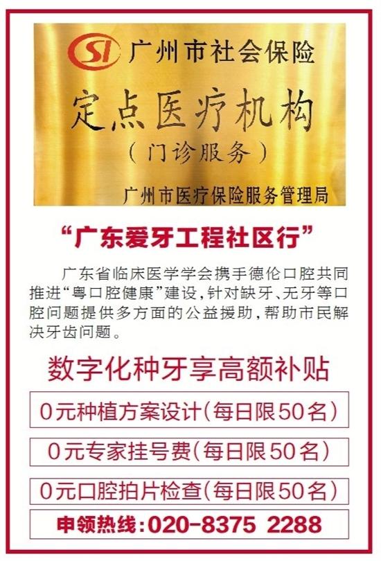 “广东爱牙工程社区行”致电020-83752288即可申请种植牙高额补贴,电话报名即可免挂号费、专家会诊费、数字化种植方案设计费。