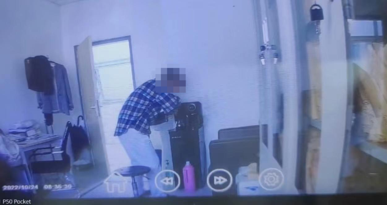 当天上午9点半左右,胡医生回到了自己的办公室内,闻了一下杯子和暖瓶,果然又出现了刺激性味道。随后,她打开了前些天安装在办公室的行车记录仪,视频果然拍到了一个身影进入到胡医生的办公室内。