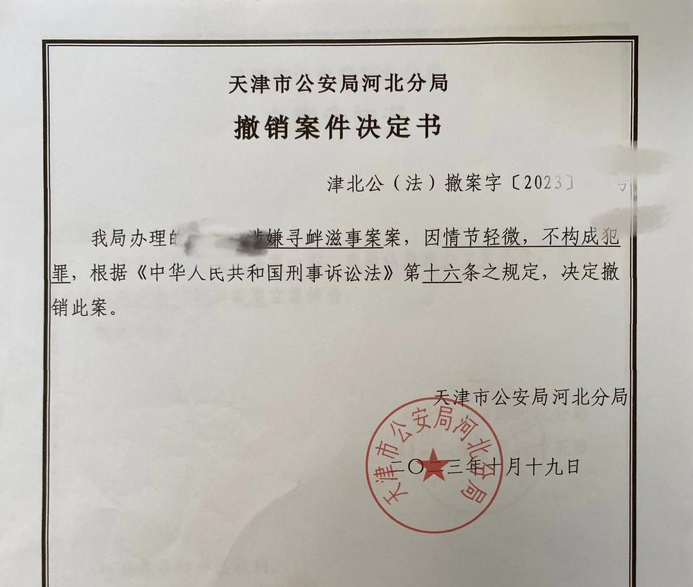 几天前,胡医生拿到了天津市公安局河北分局出具的撤销案件决定书。决定书写道:“我局办理的吴某涉嫌寻衅滋事案案,因情节轻微,不构成犯罪,根据《中华人民共和国刑事诉讼法》第十六条之规定,决定撤销此案。”