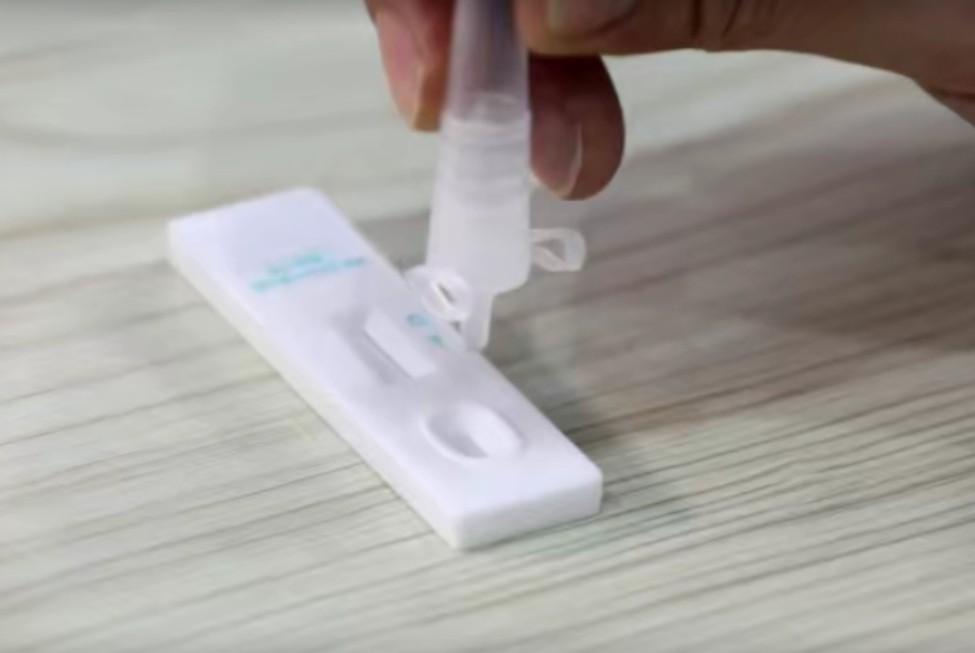 11、将提取管翻转过来,从盖口处滴3滴提取液到检测卡上。要严格按照说明书的指示来滴,滴数不够、滴数多了都可能造成“假阴性”。