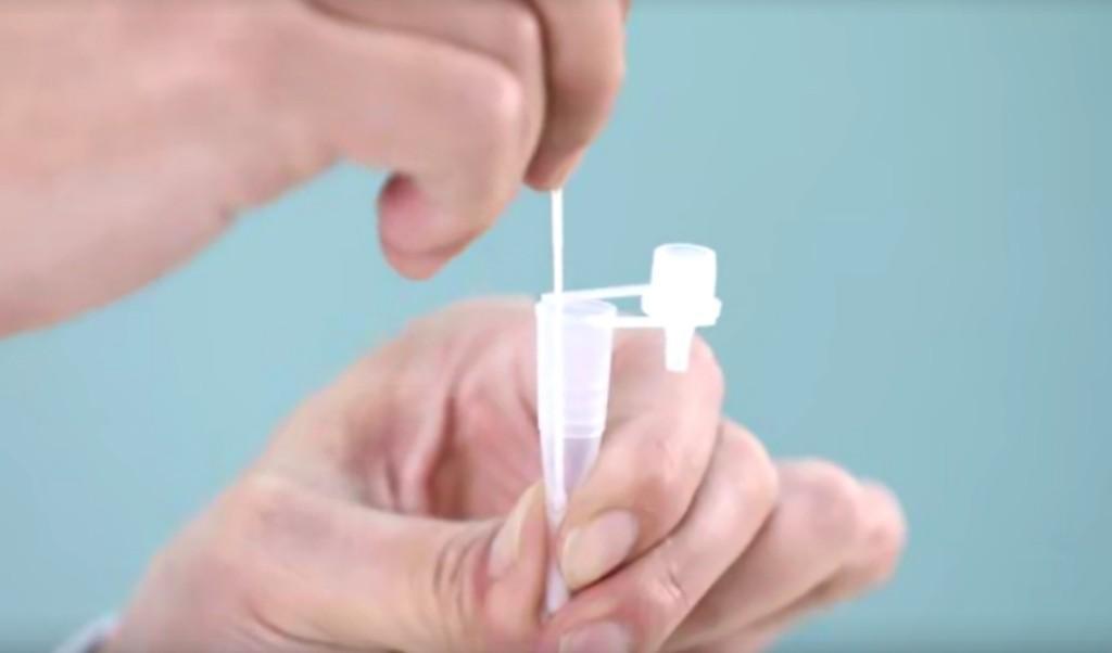 8、将拭子放入样本提取管内,拭子头浸入到提取液内,边挤压边转动拭子15秒。