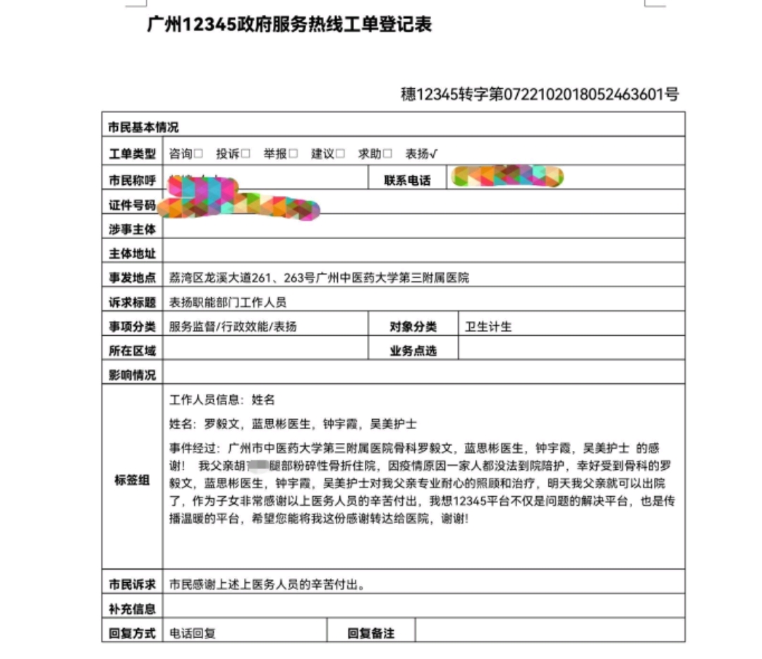 近日,广州市12345政务服务便民热线平台收到这样一份特殊的表扬工单,这是患者胡叔的家属通过12345热线平台向广州中医药大学第三附属医院创伤骨科医护人员对胡叔的悉心照顾表示的感谢。