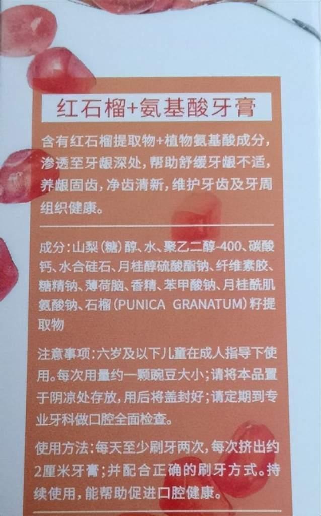 在一家名为“顺欣养生”的店铺,商家售卖的一款名为“红石榴 + 氨基酸”的牙膏,产品说明书标注为“妆”字号产品,但是商家却表示可以通过“将草本萃取的药膏渗透进蛀牙从而修复蛀牙和龋齿,使用一两盒就可以见效”。