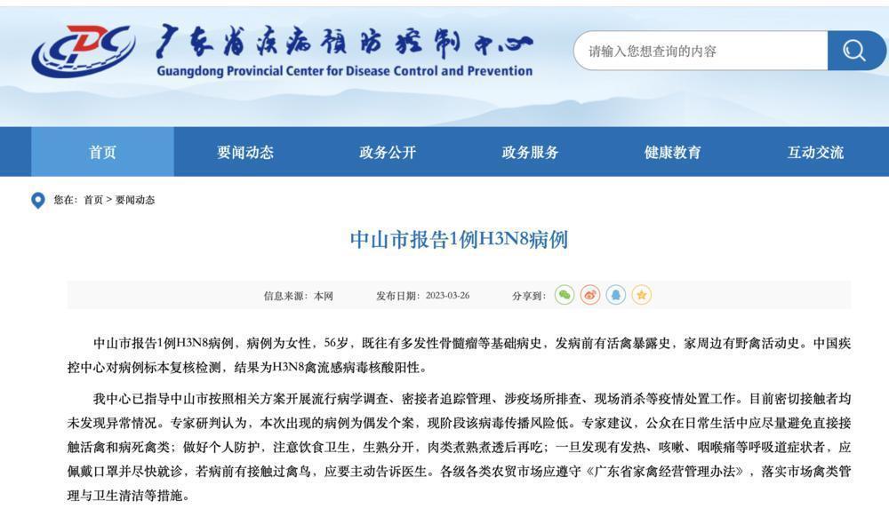 3月26日,广东省疾控中心通报,中山市报告1例H3N8病例。病例为女性,56岁,既往有多发性骨髓瘤等基础病史,发病前有活禽暴露史,家周边有野禽活动史。中国疾控中心对病例标本复核检测,结果为H3N8禽流感病毒核酸阳性。