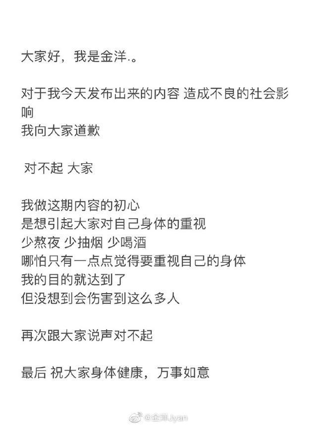 网红在评论区道歉: “我跟大家道个歉,对不起大家,会被很多人骂,其实我一开始就想到了,但为了能够引起大家对自己身体的重视,少熬夜少抽烟少喝酒,哪怕只有一点点觉得要重视自己的身体.... 对不起 大家。”