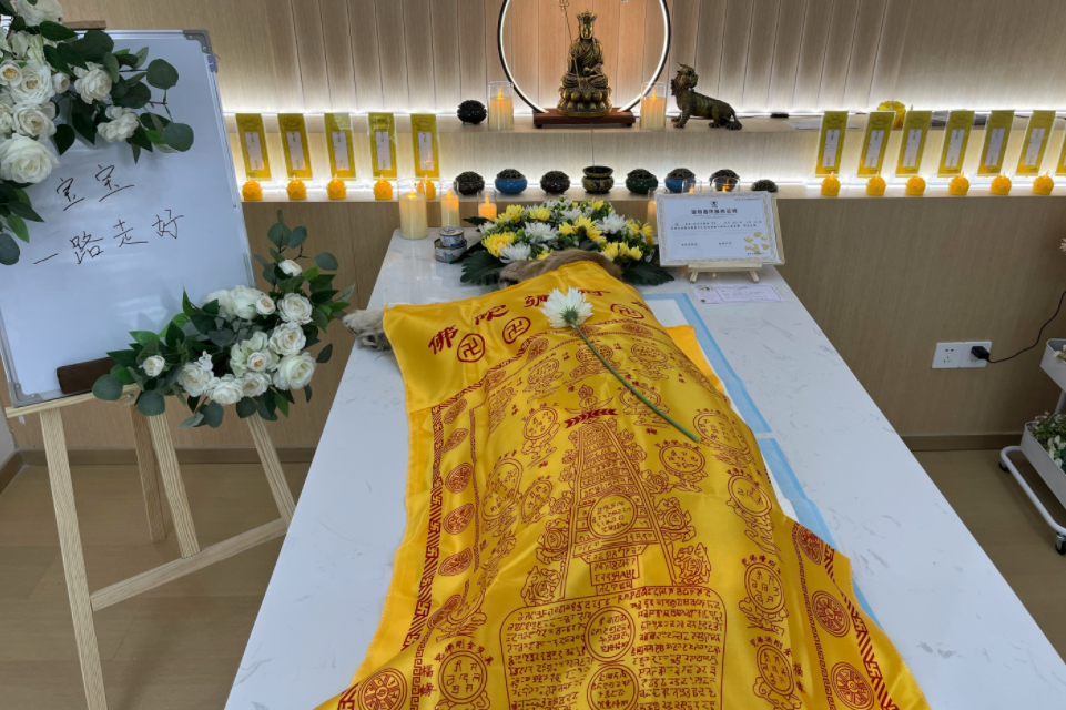 这场告别仪式,是宠物殡葬的环节之一。几天前,不到1岁的“板栗”因病去世,宠物殡葬店上门将它接走,完成告别仪式后,“板栗”将被送去火化。
