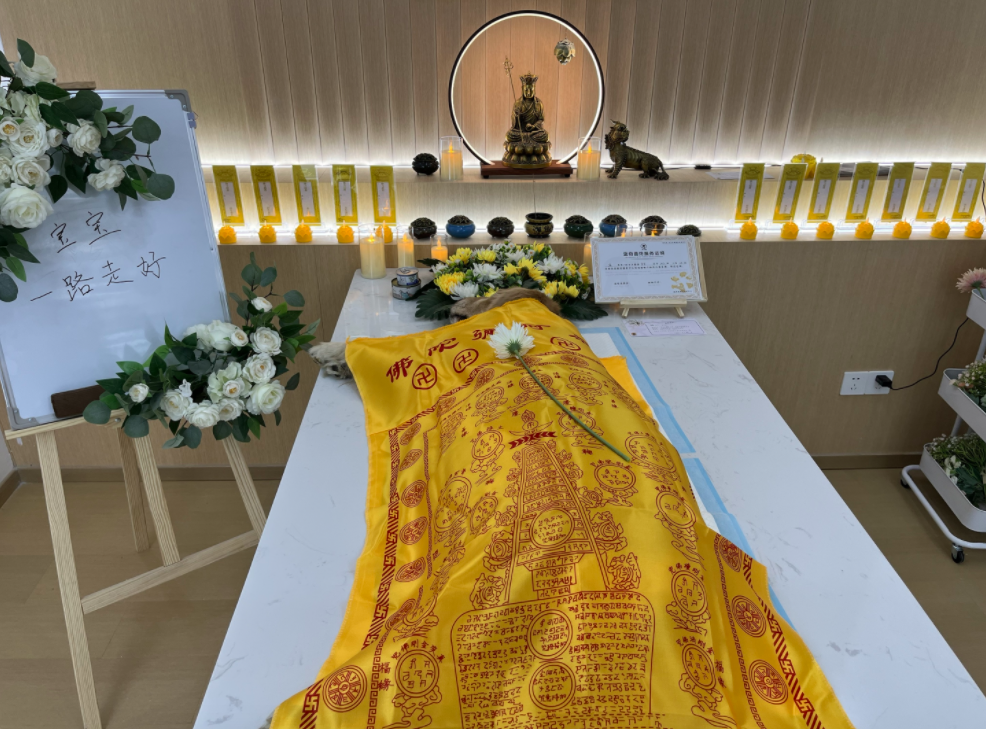 金毛犬“板栗”躺在告别室里,身旁摆满了鲜花和蜡烛,还有它最爱吃的罐头,背景音乐播放着一段经文,主人正和它做最后的告别。