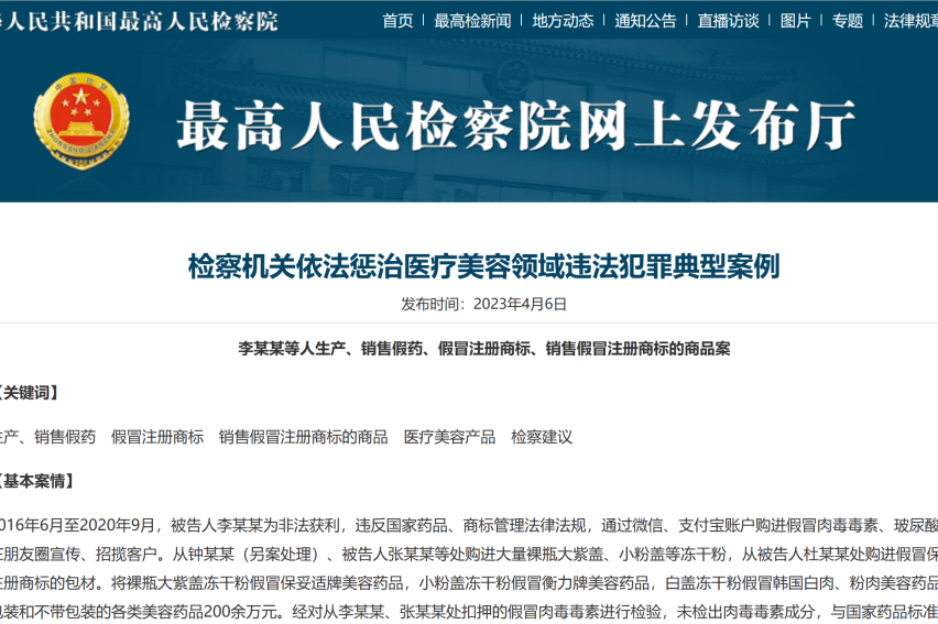 4月6日,最高人民检察院发布6件检察机关依法惩治医疗美容领域违法犯罪典型案例,包括5件刑事案件和1件公益诉讼案件,涉及生产销售假药、销售假冒注册商标、诈骗、医疗事故、非法行医等。