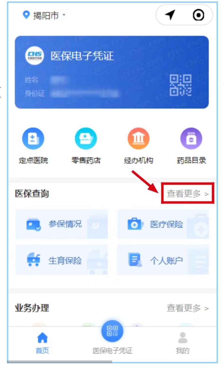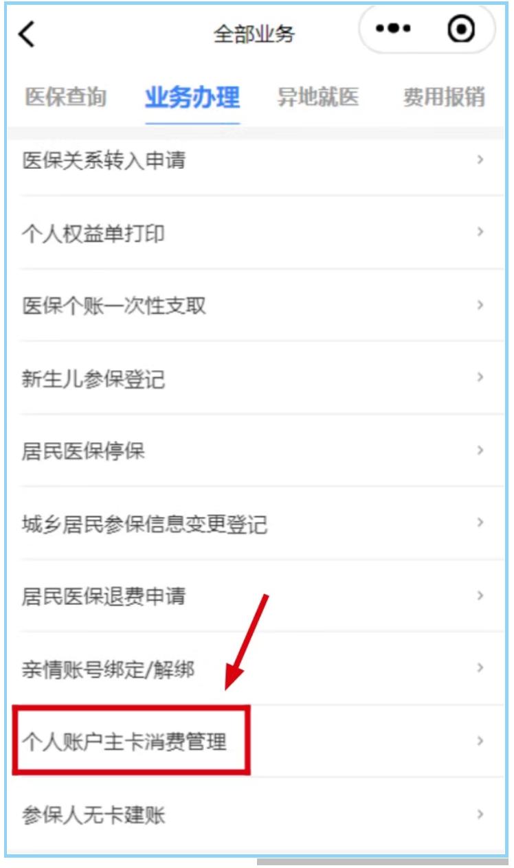 参保人在微信找到“粤医保”微信小程序,刷脸识别登录后,进入应用程序首页,点击左上角切换到当前参保地市,找到【业务办理】——【查看更多】,在【全部业务】页面选择【个人账户主卡消费管理】。