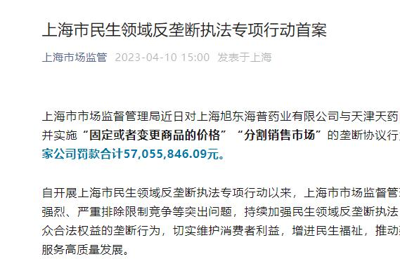 4月10日,据上海市市场监督管理局官微消息,近日对上海旭东海普药业有限公司与天津天药医药科技有限公司达成并实施“固定或者变更商品的价格”“分割销售市场”的垄断协议行为作出行政处罚,对两家公司罚款合计57,055,846.09元。