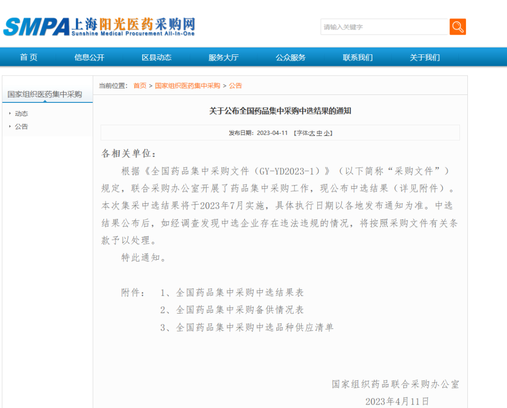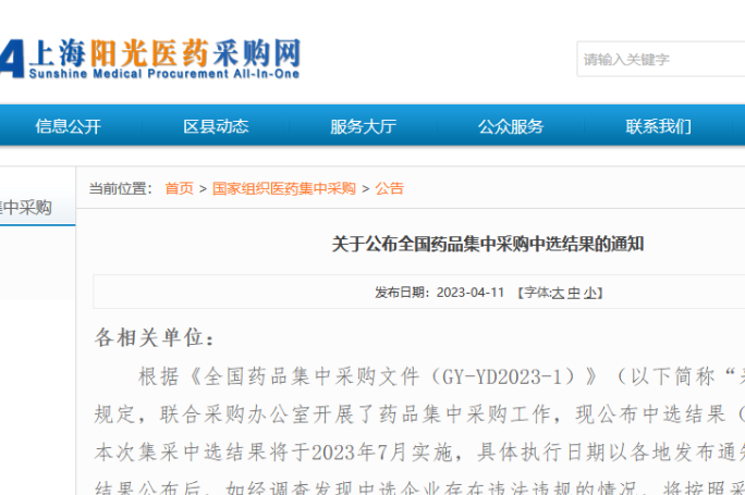 4月11日,国家组织药品联合采购办公室公布全国药品集中采购中选结果。根据《全国药品集中采购文件(GY-YD2023-1)》规定,本次集采中选结果将于2023年7月实施。