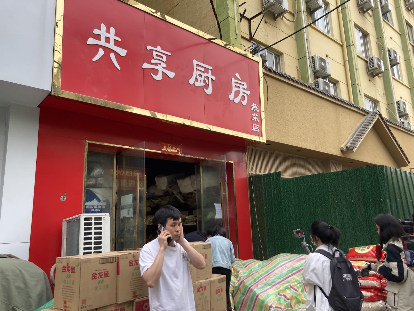小区门卫说,平时共享厨房的人隔三差五会来取物资。