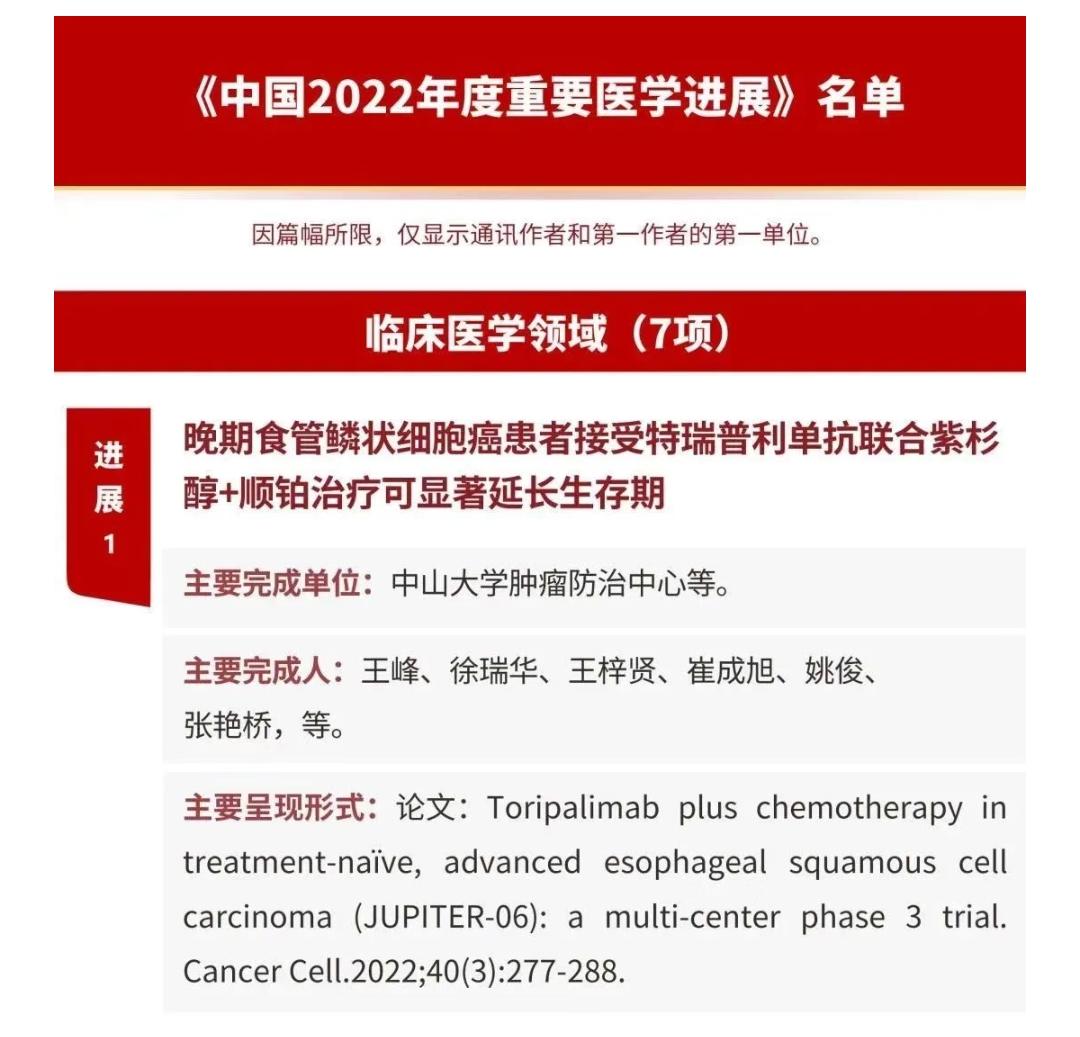 据介绍,《中国年度重要医学进展》(以下简称《重要进展》)聚焦我国学者在该年度医学科学领域产生重要影响的、国际关注度大的或应用潜力大的重要研究成果。在不久前刚刚公布的《中国2022年度重要医学进展》临床医学领域名单中,中山大学肿瘤防治中心的研究成果《晚期食管鳞状细胞癌患者接受特瑞普利单抗联合紫杉醇+顺铂治疗可显著延长生存期》名列榜首。