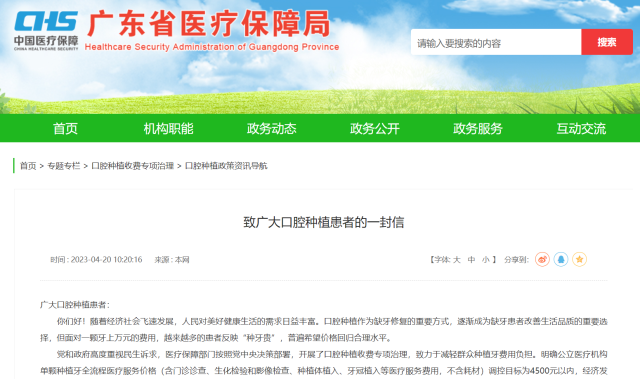 20日,广东省医疗保障局在官网发布了《致广大口腔种植患者的一封信》。信中提醒,部分医疗机构并未全部接受三项治理措施,单颗种植牙费用可能会比较高。建议患者种牙先上医保局网站看一看,首选接受全部三项治理措施的口腔医疗机构。
