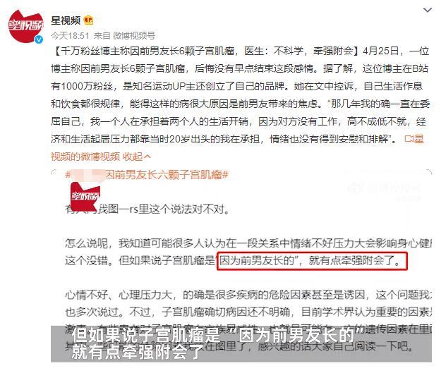 4月25日,一位博主称因前男友长6颗子宫肌瘤,后悔没有早点结束这段感情。据了解,这位博主在B站有1000万粉丝,是知名运动UP主还创立了自己的品牌。她在文中控诉,自己生活作息和饮食都很规律,能得这样的病很大原因是前男友带来的焦虑。“那几年我的确一直在委屈自己,我一个人在承担着两个人的生活开销,因为对方没有工作,高不成低不就,经济和生活起居压力都靠当时20岁出头的我在承担,情绪也没有得到安慰和排解”。