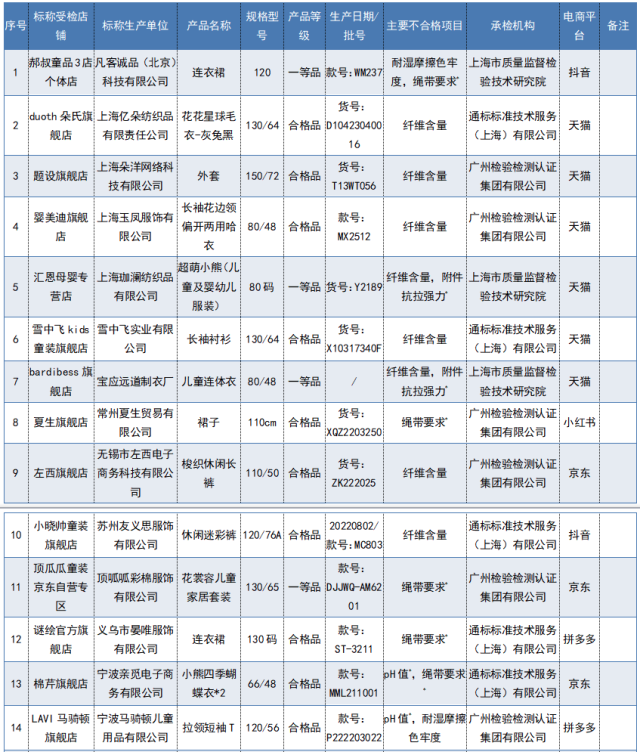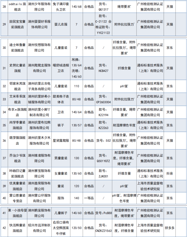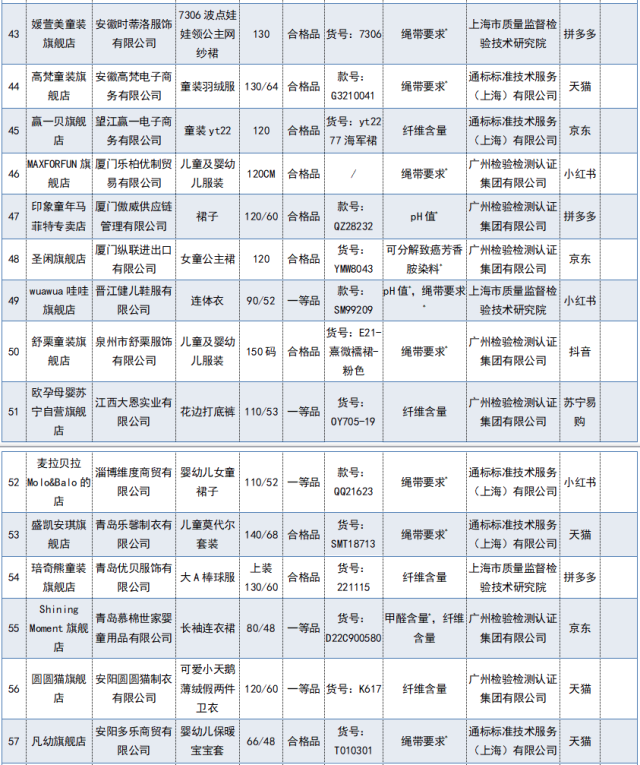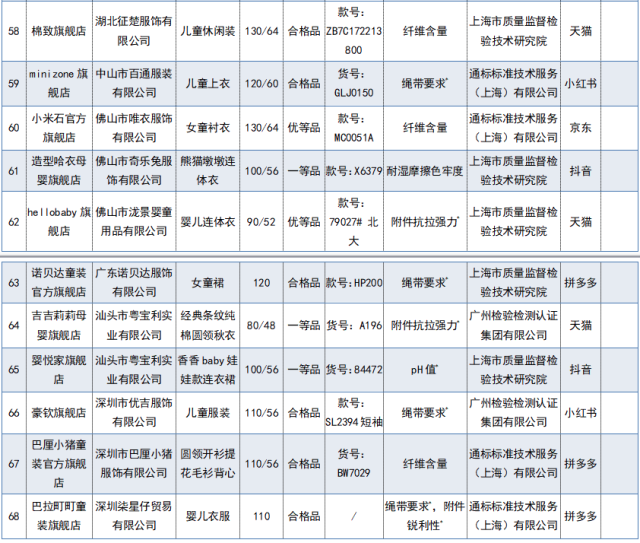 近日,市场监管总局通报去年网售儿童及婴幼儿服装质量的国家监督抽查结果,发现68批次产品不合格。其中销售网店涉及雪中飞kids童装旗舰店、哈齿童装官方旗舰店、卓诗尼母婴旗舰店、史努比童装旗舰店、布衣e族旗舰店和巴厘小猪童装官方旗舰店等,生产单位涉及“凡客诚品”、“雪中飞”、“顶呱呱”、“慕棉世家和“巴厘小猪”等。