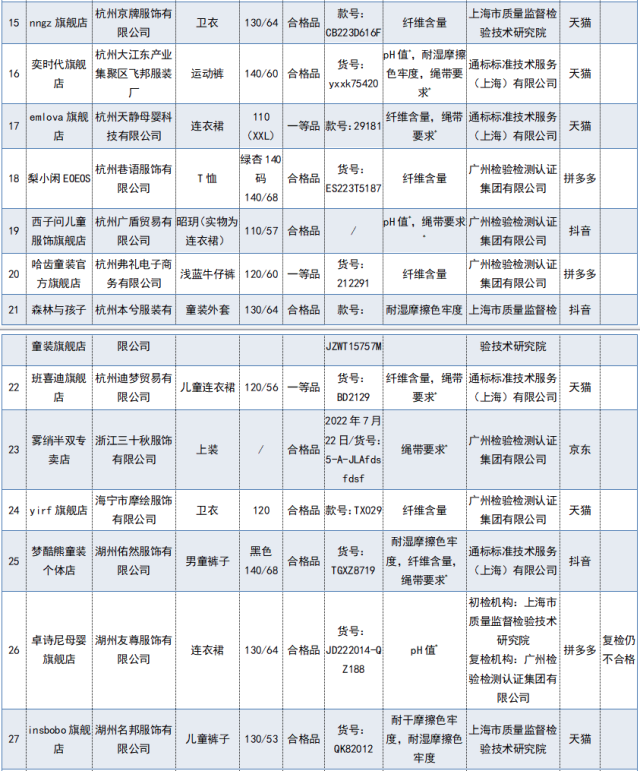 发现不合格项目为甲醛含量、pH值、可分解致癌芳香胺染料、耐干摩擦色牢度、耐湿摩擦色牢度、纤维含量、附件抗拉强力、绳带要求、附件锐利性。