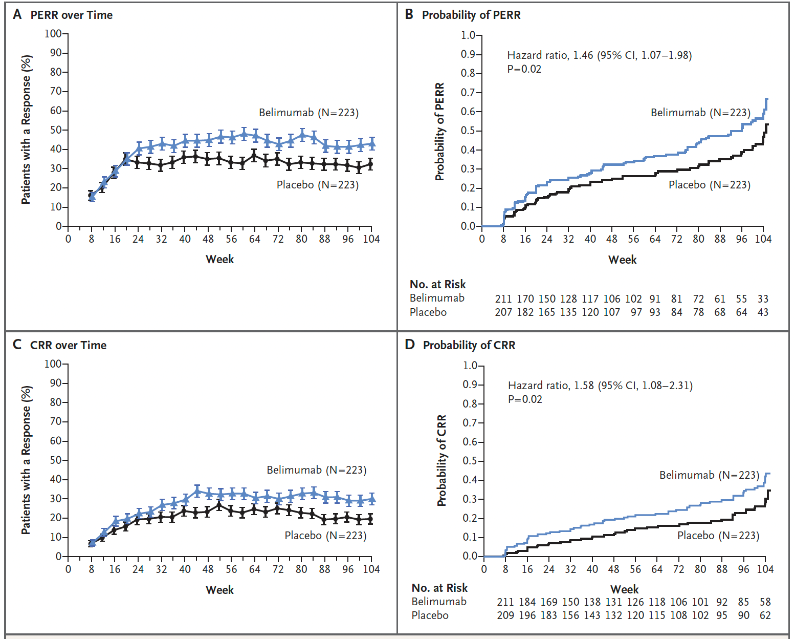 贝利尤单抗治疗狼疮性肾炎的国际多中心研究(BLISS-LN)(有21个国家参与的国际多中心研究)是截至目前最大规模的针对活动性LN的随机、对照Ⅲ期临床研究。结果显示在整个研究周期(104周)中,与对照组相比,在标准治疗基础上加用贝利尤单抗,能够改善LN患者的肾脏应答率,降低肾脏相关事件/死亡的风险,减少激素用量,且安全性与对照组相当,有力地证明了贝利尤单抗治疗LN的有效性与安全性。