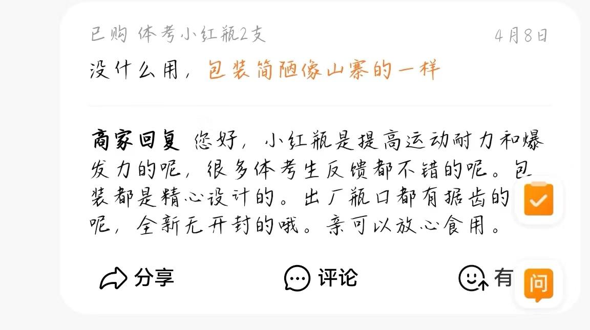 价格高低不同、质量参差不齐的“体考神器”真的有用吗?在电商评论区,记者发现大多数商品都以好评为主,其中不乏有“3000米提高了20秒”“1000米跑完不累”“喝完猛如虎”等评价,俨然一味“神药”。
