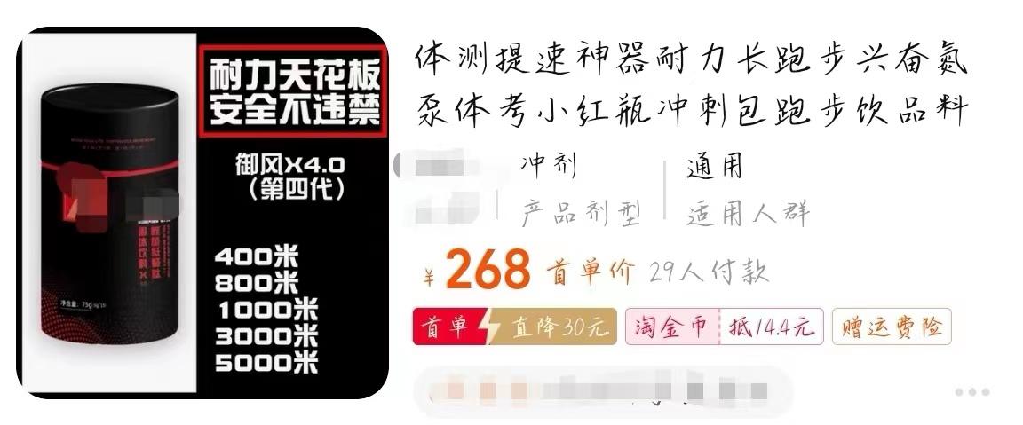 在电商平台,记者在搜索“体考小红瓶”后发现了数百个产品,价格在9.9元-268元不等。在宣传中,大多数产品均以“提高体考成绩”“防止紧张零失误”“无副作用”等,吸引考生与家长购买。