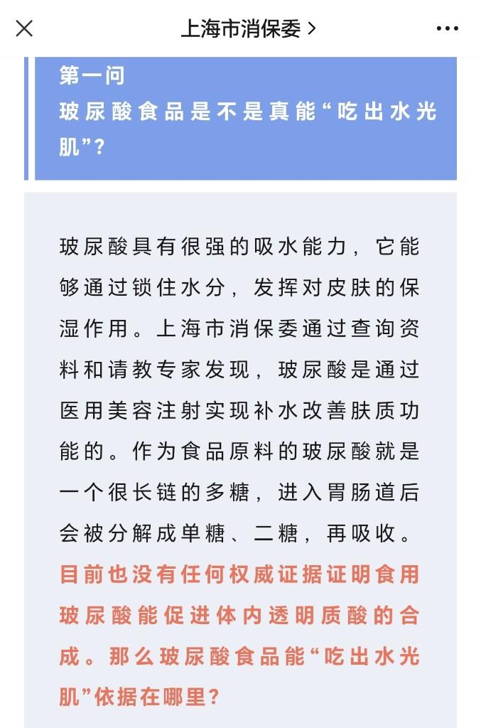 不少俊男靓女口中的“打水光针”,指的便是通过注射玻尿酸至真皮层,从而达到保湿补水的效果。口服玻尿酸也能达到一样的效果吗?日前,上海市消保委公众号发布《四问玻尿酸食品乱象》引发热议,文章就玻尿酸食品是不是真能“喝出水光肌”发出疑问,并指出目前没有任何权威证据证明食用玻尿酸能促进体内透明质酸的合成。