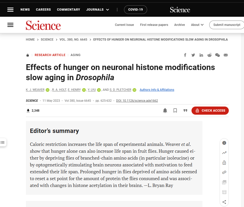 在限制食物的前提下,通过控制BCAA(支链氨基酸)的摄入,或许对延年益寿有帮助。5月11日,《科学》杂志刊登了密歇根大学研究人员的一项研究论文:Effects of hunger on neuronal histone modifications slow aging in Drosophila《饥饿对神经元组蛋白修饰的影响减缓了果蝇的衰老速度》。研究人员通过两组果蝇对比实验发现,饥饿感可以影响果蝇大脑中特定基因的表达水平,从而影响它们的进食行为和衰老过程。