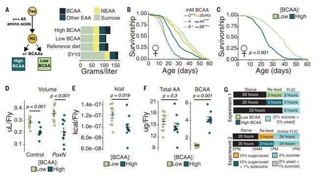 与高BCAA果蝇相比,尽管低BCAA果蝇消耗了更多的热量和更多的总蛋白质,但它们的寿命明显更长。也就是说,减少饮食中的BCAA可以使果蝇产生饥饿感,而这种饥饿感可以促进果蝇进食并延长其寿命。