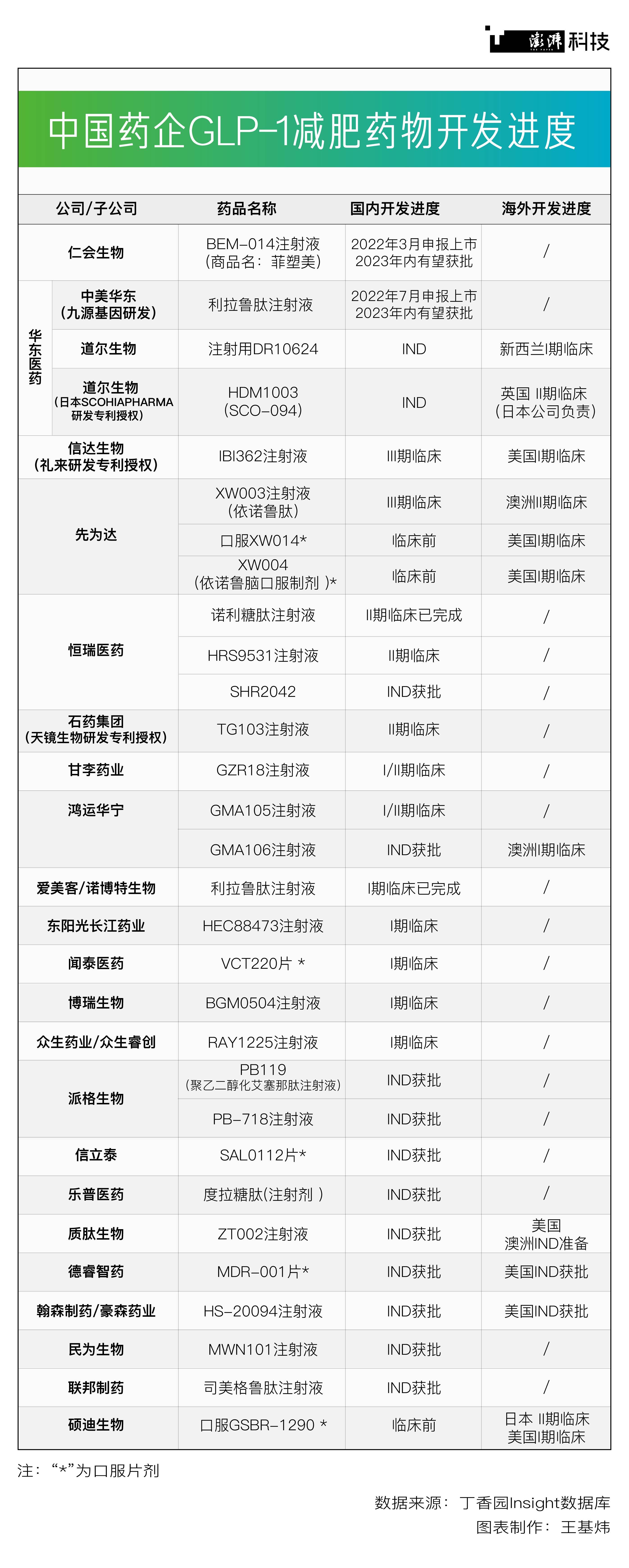 记者统计发现,目前国内企业研发的司美格鲁肽类似药至少有10款,唯一一家已就肥胖适应征申请临床并获批准的,是联邦制药(03933.HK)的司美格鲁肽类似药,其针对2型糖尿病的临床试验也已进入三期。它们都跃跃欲试想在2026年前抢先“分一杯羹”。