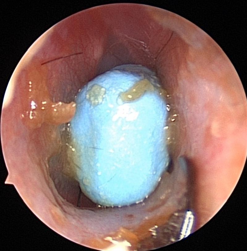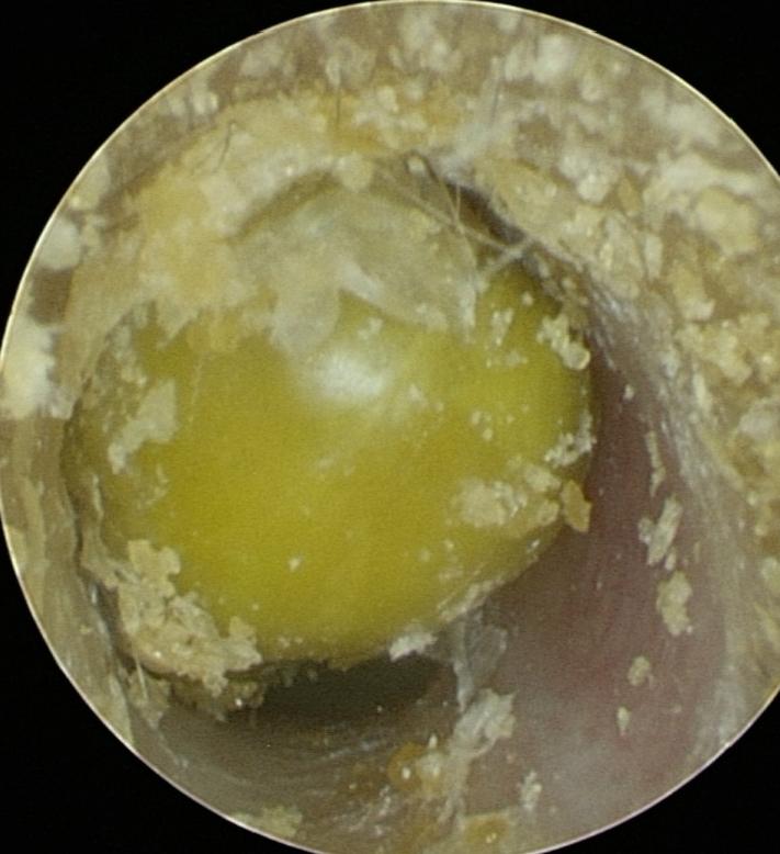 小许今年三年级,近段时间老觉得左耳闷堵感及耳鸣,有时还听不清,告知妈妈后,到附近中医馆就诊,吃了1周中药,效果欠佳。预约了中山一院耳鼻咽喉科就诊,接诊医生发现耳朵里有绿色异物。追问小许怎么回事,小许支支吾吾,说了原因。1个月前学校组织外出学农,玩耍时同桌小徐说小许耳洞好大,就塞了一颗绿豆进去,小许当时觉得没有什么不舒服,过了几天就忘记了,因此也没有告诉父母。在门诊耳内镜下取出绿豆1粒,鼓膜完好。