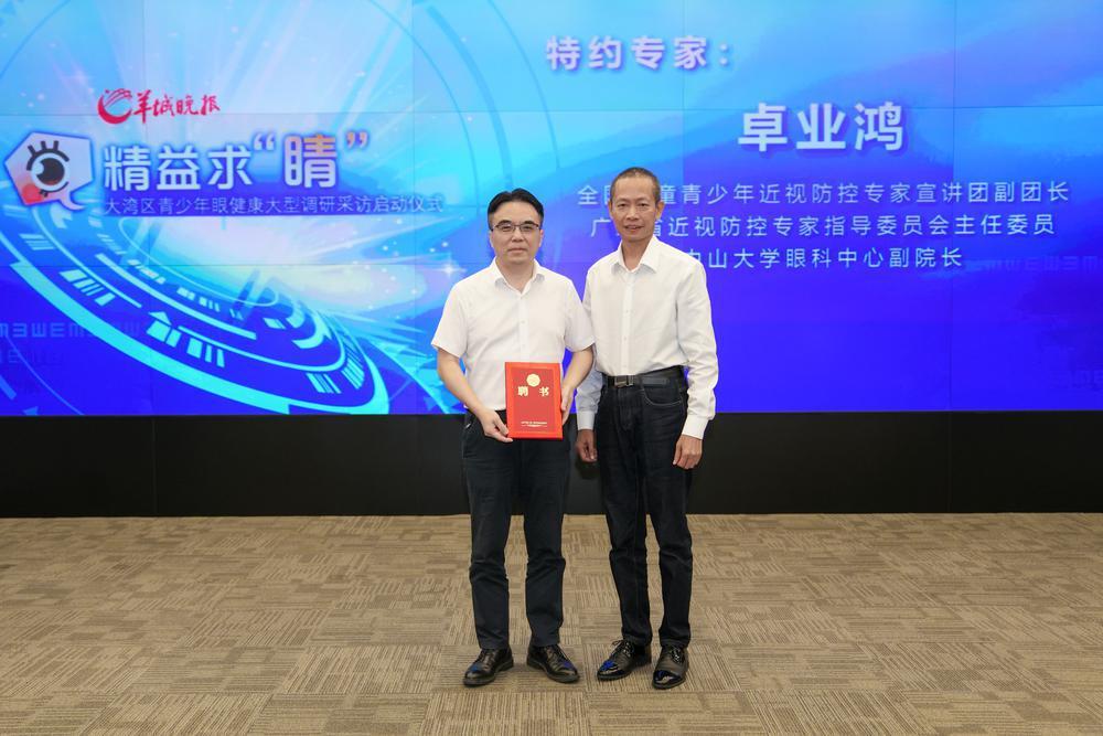 启动仪式上,中山大学眼科中心副院长卓业鸿、广州市第一人民医院鹤洞分院副院长冷云霞、广州市中小学卫生健康促进中心学校卫生工作部主任郭仰峰受聘为羊城晚报精益求“睛”青少年眼健康科普宣传特约专家。