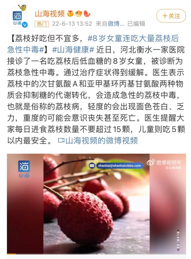 之前湖南就出现了一例因吃荔枝引发中毒的案例,空腹吃荔枝引发中毒!