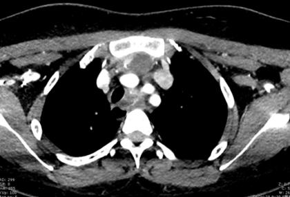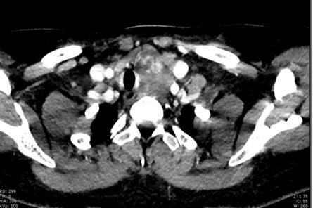 通过完善颈部增强CT、肺CT、纤维喉镜等相关检查,结果显示患者甲状腺左侧叶的巨大肿瘤已经挤压得气管严重右偏,部分腺体已经生长到了胸骨后,而且甲状腺的最下端已经深入到主动脉弓的位置。