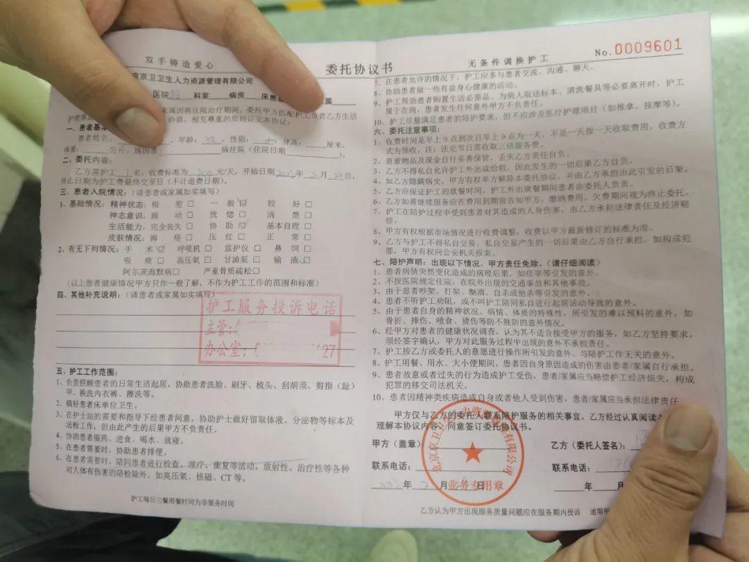 在北京的另一家医院,一名病人家属向记者出示的护工委托协议单显示,收费标准200元/天。护工工作范围:负责照顾患者的日常生活起居,协助患者洗脸、刷牙、梳头等,搞好患者床单位卫生,在护士站的需要和指导下经患者同意,协助护士做好留取体液、分泌物等标本及送检工作等。