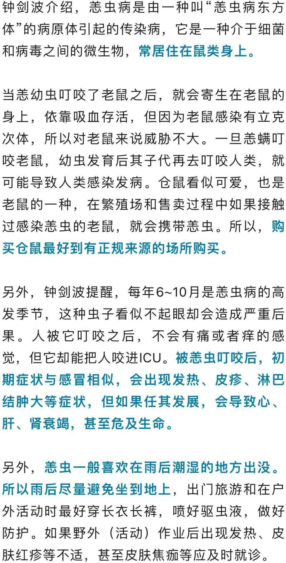 听吴霞这么一说,再结合她的身体症状,钟剑波基本确定她是患上了恙虫病,而罪魁祸首很有可能就是这20元钱买的仓鼠。