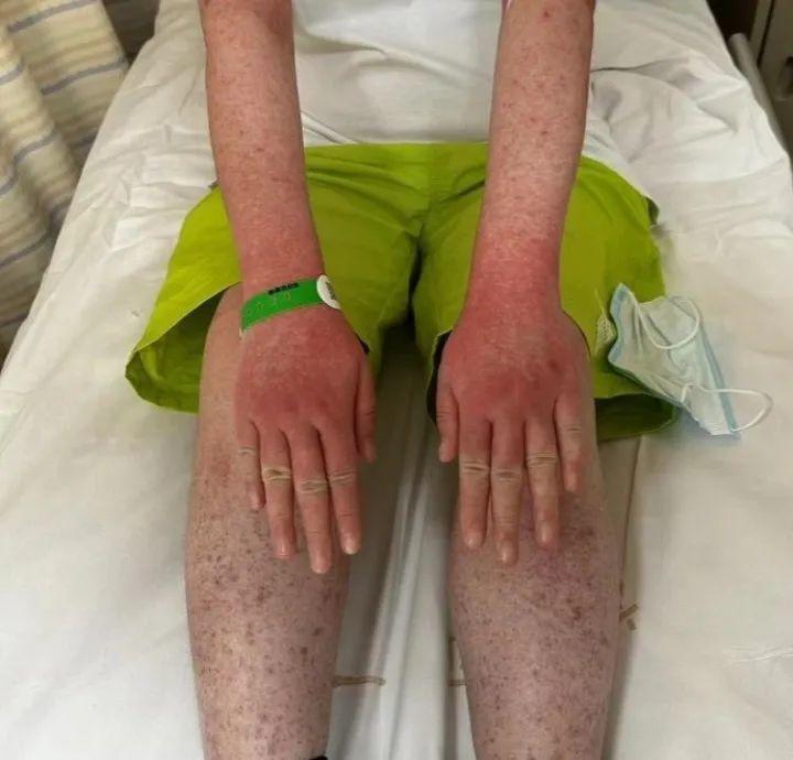 吴霞回忆,大概一周前,她突然开始发热,体温达到40℃,足足烧了四天都不退。一开始,她身上出现了小范围的皮疹,渐渐地,皮疹蔓延到她的全身和脸部,密密麻麻,看上去红紫色的一大片,十分吓人,这才在家人的陪伴下来到了医院。