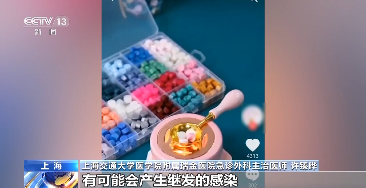 另一个短视频中,能看到小朋友在玩火漆印章过程中,手指似乎碰到了装蜡粒小勺子的勺柄。记者采访了解到,儿童在玩火漆印章时,加热溶化后,蜡烛一旦操作不当就可能造成比较严重的烫伤。