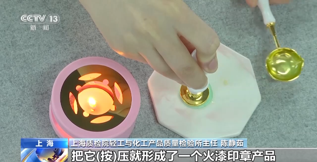 上海质检院轻工与化工产品质量检验所主任 陈静茹:火漆印章的玩法是点燃这个蜡烛,然后将熔蜡勺放置在蜡烛台上。我们用彩色火漆蜡粒放置在熔蜡勺里面,燃烧加热一定时间之后,熔蜡勺里的蜡粒熔化,然后小朋友就把它直接倒在垫板上,再用这个印章头按压就形成了一个火漆印章产品。