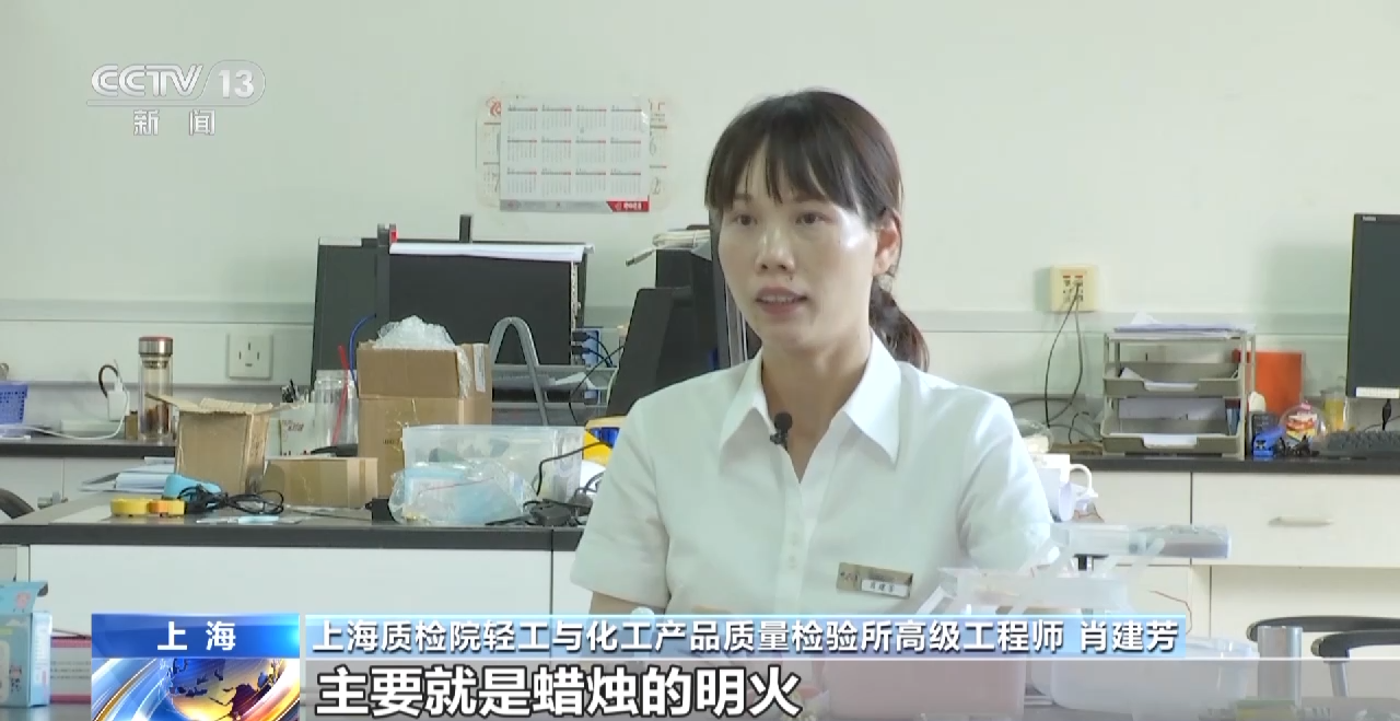 上海质检院轻工与化工产品质量检验所高级工程师 肖建芳:本次风险监测的最大风险点,主要就是蜡烛的明火,总共20批次的样品中有18批次的样品是含有蜡烛的。
