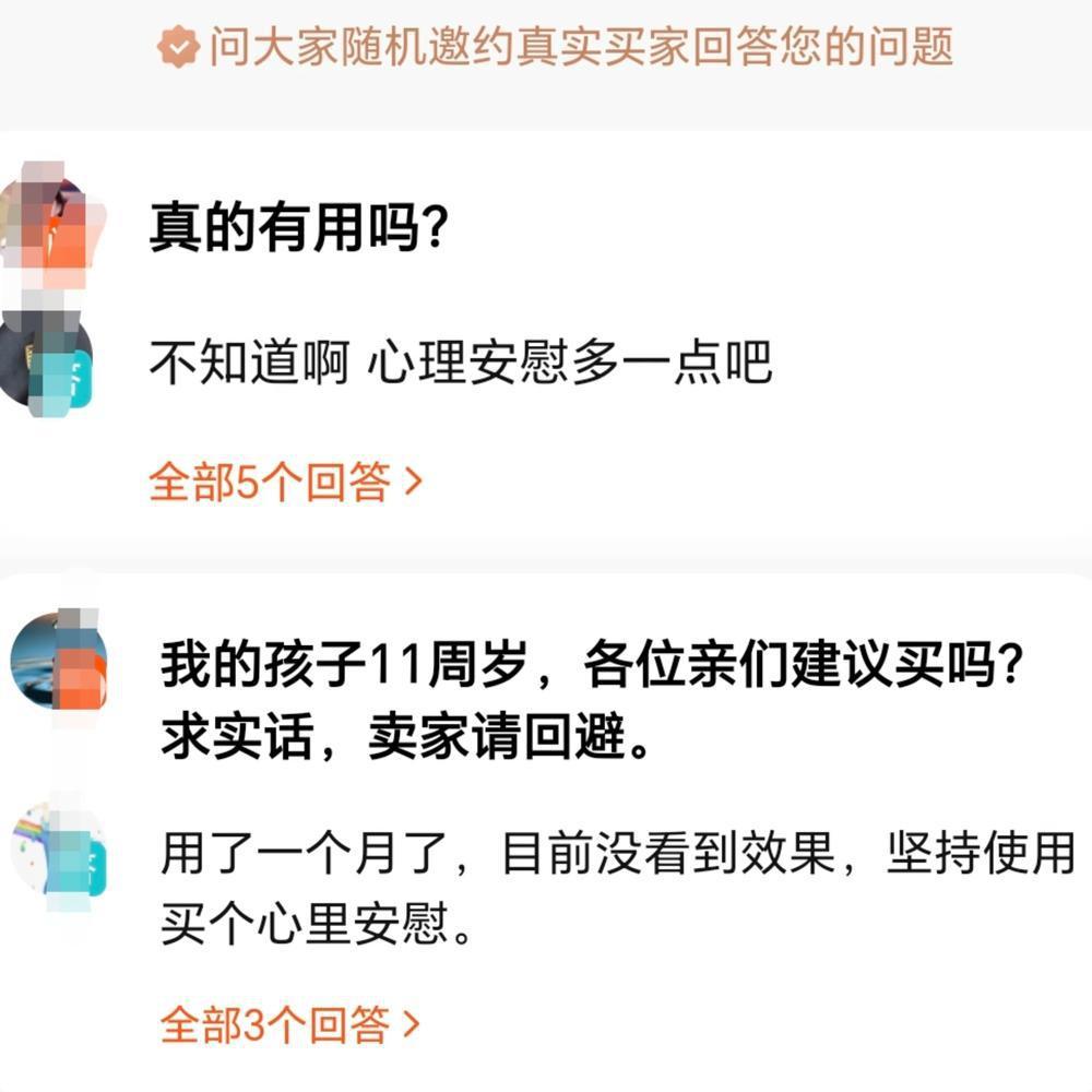 记者在多家电商平台输入曾女士购买的一些长高“神器”产品名称,发现它们的销量都比较高,有的甚至月销量能达到1万多。在产品的提问区里,还有些未购买的家长前来咨询已购买的家长:究竟有没有用?后者回答:不知道,当是买个心理安慰吧。