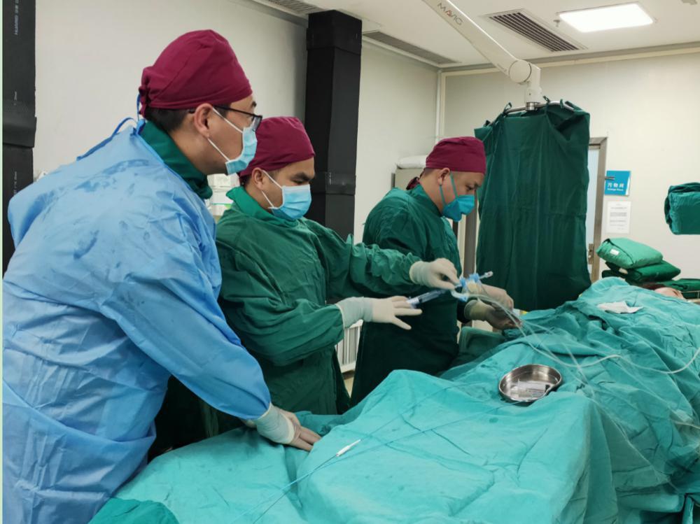 在有创呼吸机与各种升压药物的辅助下,陈武奇副主任医师为胡阿姨进行了股静脉的穿刺,成功送入导管,找到血栓的位置,利用机械进行负压抽吸。