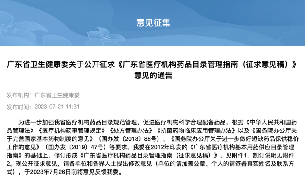 7月21日,广东卫健委发布关于公开征求《广东省医疗机构药品目录管理指南(征求意见稿)》意见的通告,对医疗机构配备药品的限制做了进一步放宽等调整。