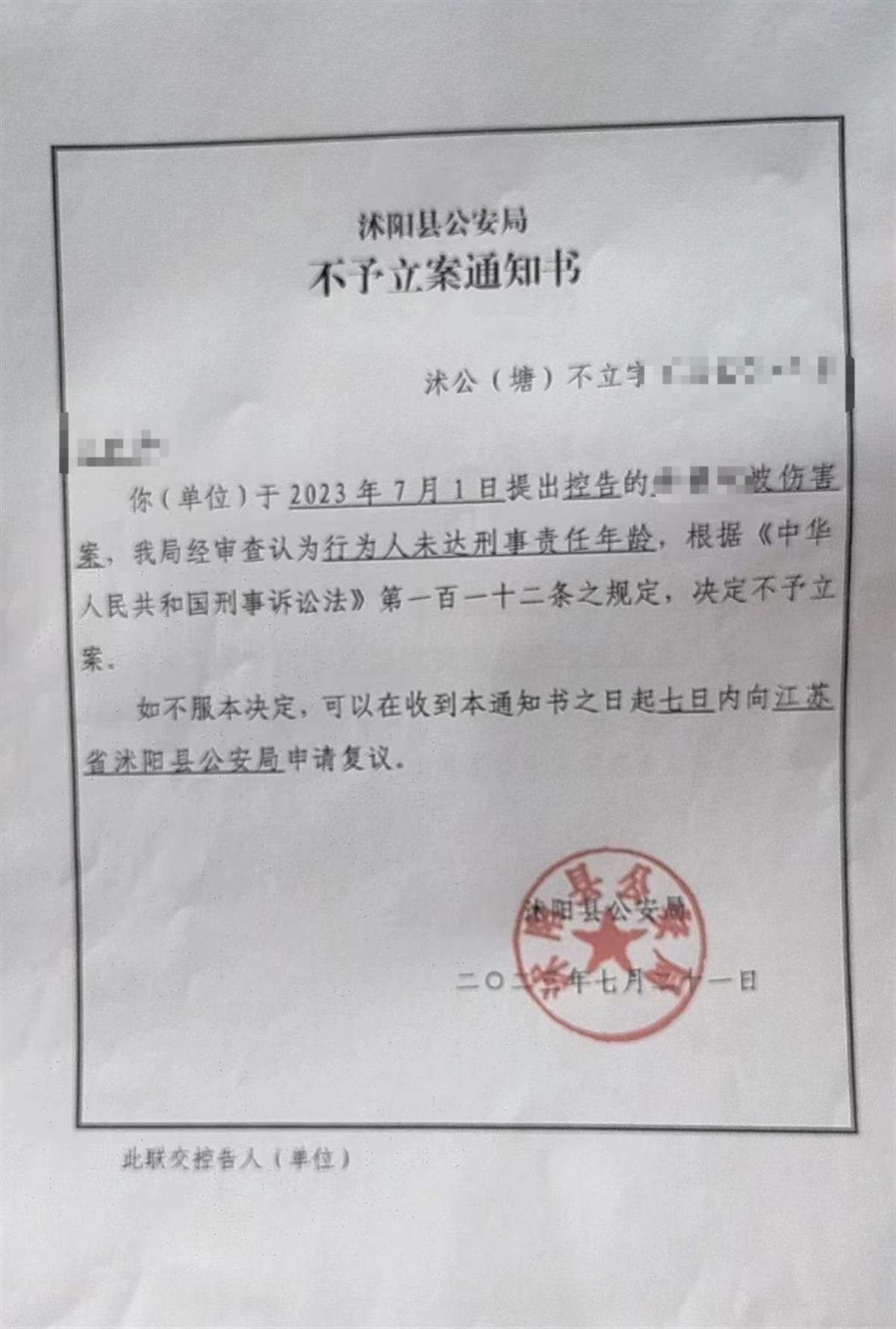 7月21日,沭阳县公安局向司女士出具了两份通知书,一份是不予立案通知书,一份是鉴定意见通知书。不予立案通知书中提到,该局经审查认为,行为人未达刑事责任年龄,根据《中华人民共和国刑事诉讼法》第一百一十二条之规定,决定不予立案。鉴定意见通知书则指出,已对安安的伤情进行了损伤程度鉴定。鉴定意见是安安左眼部的损伤初评构成轻伤二级。