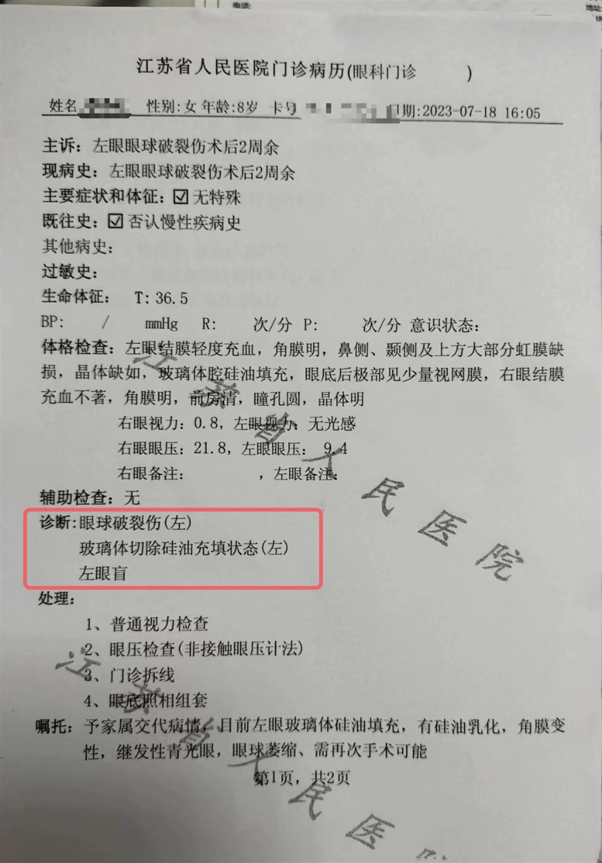家属提供的近日在江苏省人民医院复查病历显示,安安左眼球破裂伤,左眼玻璃体切除硅油充填状态,左眼盲。并提示其目前左眼玻璃体硅油填充,有硅油乳化,角膜变性,继发性青光眼,眼球萎缩,需再次手术可能。
