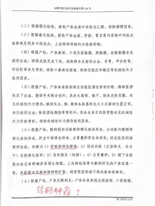 云南维权司法鉴定中心进行了尸检,诊断为肝脏转移性腺癌,急性肠炎(结肠)等,并未见直肠癌。尸检注明,病检结果与解剖所见的尸体征象一致、相互印证,多脏器未见癌细胞转移扩散,病变程度轻微不构成致命性病变,符合失血性休克死亡的法医病理学特征。