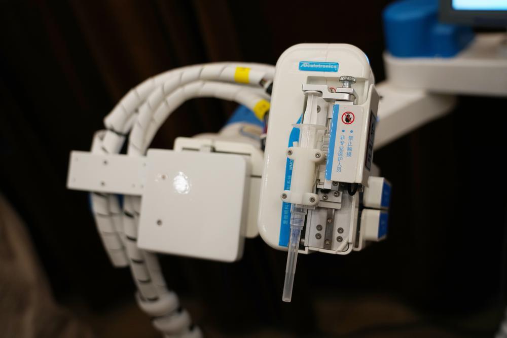 林浩添向记者介绍了这一手术机器人的药物精准注射技术亮点:“以视网膜发生病变需要进行手术为例,按照常规治疗方案,原则上来说,应通过手术把药物注射到视网膜内发生病变的部位才能达到最佳疗效,但目前医生的手还做不到,多是注射到视网膜前的玻璃体腔内,这是因为受限于人手的生理震颤和抖动,要达到智能机械臂微米级的精细稳定操作还是比较困难的。而我们研发的这一手术机器人可以实现。”