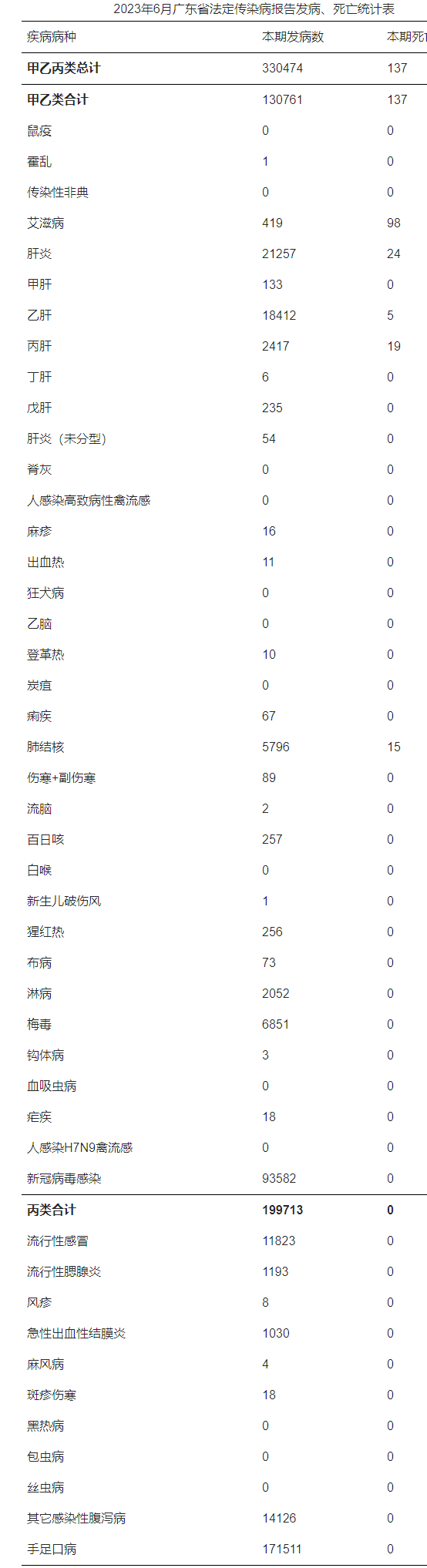 2023年6月(2023年6月1日0时至6月30日24时),全省共报告法定传染病330474例,死亡137例。