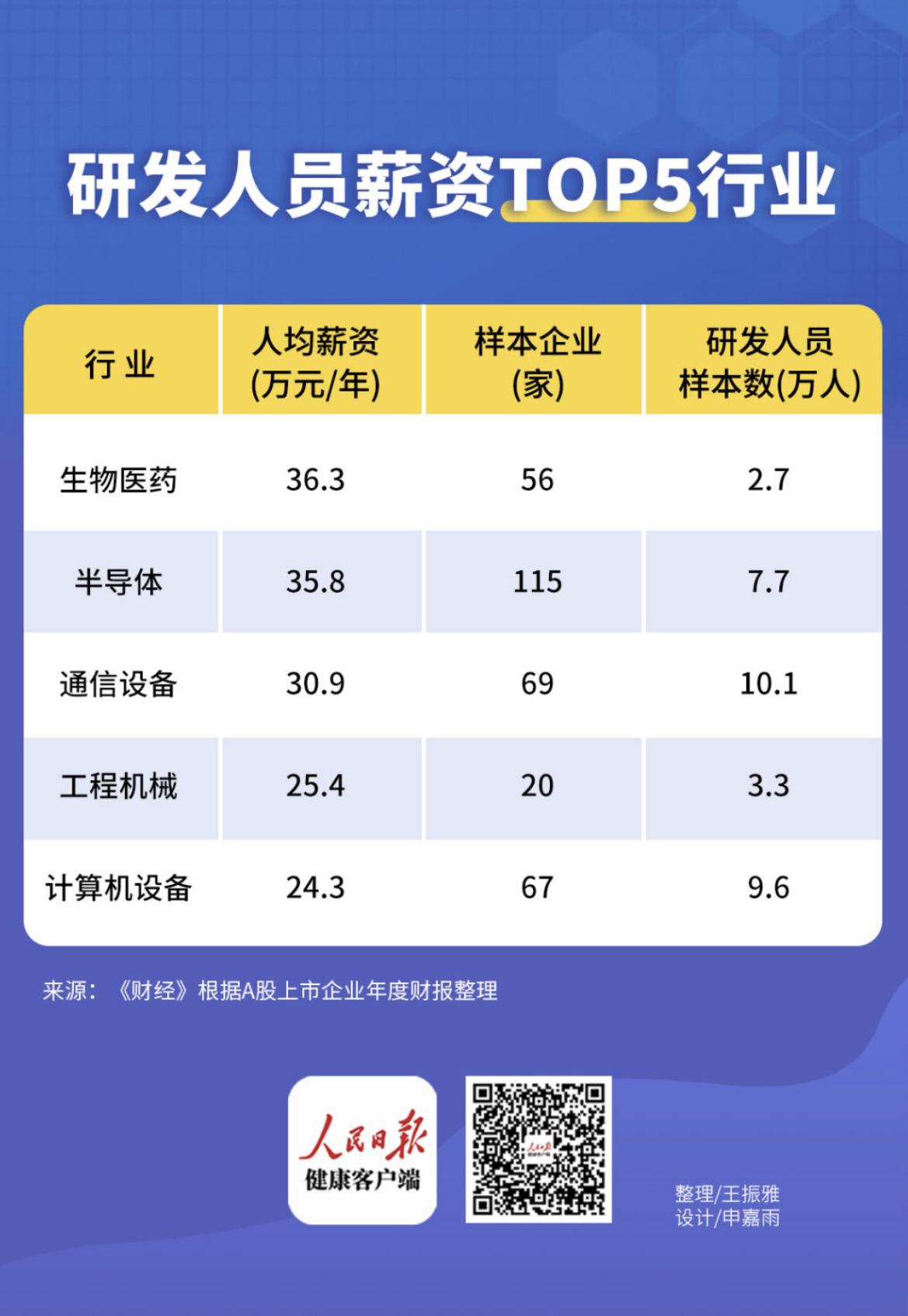 7月24日,《财经》发布A股上市公司研发人员薪酬待遇最高的10个行业,包括化学制药、光电、云服务、计算机、工程机械、通信、半导体、生物医药等,其中生物医药研发人员人均薪资最高。