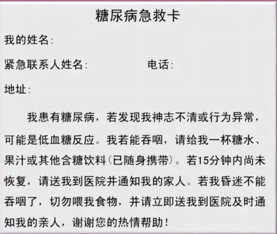 出门旅游的糖尿病患者,尤其是1型糖尿病患者,容易出现低血糖的情况。韩亚娟指出,随身携带⼀张急救卡非常重要,关键时刻可以救命!